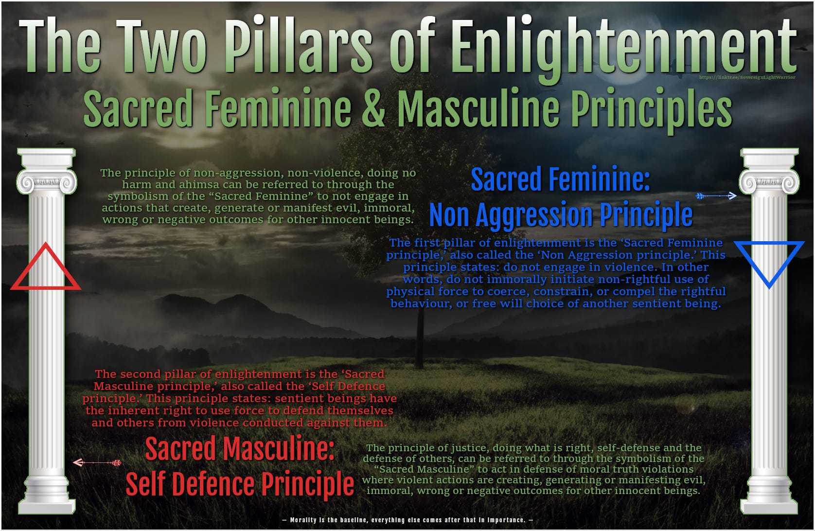 The first pillar of enlightenment is the ‘Sacred Feminine principle,’ also called the ‘Non Aggression principle.’ This principle states: do not engage in violence. In other words, do not immorally initiate non-rightful use of physical force to coerce, constrain, or compel the rightful behaviour, or free will choice of another sentient being.